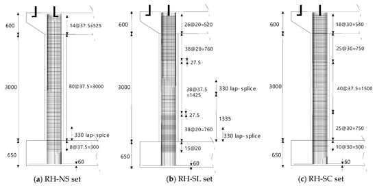 The longitudinal reinforcements were lap-spliced up to 330 mm from the bottom for the RH-NS set. Only 50% of the longitudinal bars were lap-spliced in the lower region and 50% in the middle region for the RH-SL set. In the case of the RH-SC set, the longitudinal reinforcements were extended from the foundation to the top continuously without any lap-splicing. Each set consists of two specimens, one for longitudinal direction loading and the other for transverse direction loading.