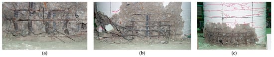 Failure of the longitudinal loading specimens. (a) Buckling and fracture of the longitudinal reinforcement bar of the RH-NS-L specimen (5); (b) Fracture of the longitudinal reinforcement bar of the RH-SL-L specimen (7); (c) Buckling and fracture of the longitudinal reinforcement bar of the RH-SC-L specimen (7).