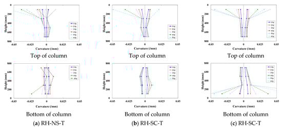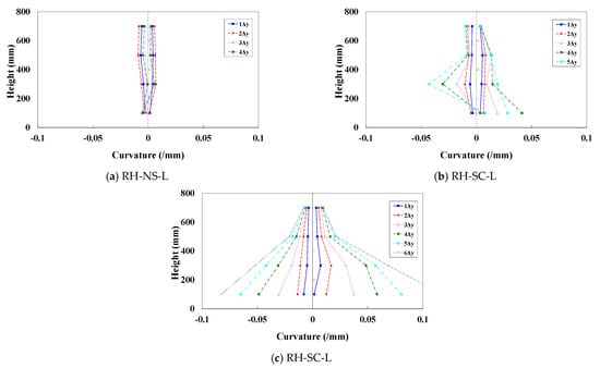 Figure 7 shows the distribution of curvature along the height from the bottom of the column for the longitudinal loading test specimen. The lap-splice of longitudinal reinforcements increases the longitudinal reinforcement ratio. Because lap-splices increase the longitudinal reinforcement ratio, the curvature of the corresponding region decreases. Therefore, the RH-NS-L specimen has the smallest curvature and the RH-SC-L specimen has the largest curvature. This does not mean that the RH-NS-L specimen does not have small amounts of damage, but it does mean that the damage is concentrated in the lowermost part, where the curvature was not measured.