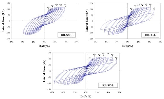 In the case of the RH-SL-L specimen, since the longitudinal reinforcement ratio of the lap-splice region was relatively smaller than that of the RH-NS-L specimen, cracks occurred earlier at the bottom. At 6.0, spalling of the compression part was intensified and the concrete cover began to fall off severely. In the case of the RH-SC-L specimen, several cracks occurred even under 350 mm because the ratio of the longitudinal reinforcement was the same for all sections. At 7.0, the transverse reinforcement bar at the bottom was deformed due to the buckling of the longitudinal reinforcing bar. However, the gap between the transverse reinforcement bars was determined to prevent buckling of the longitudinal reinforcement bars, so excessive buckling did not occur.