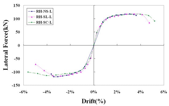 Figure 8 shows the load-drift ratio hysteresis curve of the longitudinal loading specimens. For the RH-NS-L specimen, even after the maximum load, it shows a relatively smooth decrease in the hysteresis curve. According to the results of various experiments performed so far, it is expected that the non-ductile behavior will occur due to the bond failure of the reinforcement bar. However, in this test, even if the hysteresis curve goes up to 5.0, it can be seen that the curve is almost stable. This is because there was no slip between the reinforcement bars raised from the foundation and the column reinforcement bars, and fracturing occurred like with the continuous reinforcement bars. The load-drift ratio curve of RH-SL-L specimen shows a very stable hysteresis up to a ductility of 6.0. It shows more stable behavior than the RH-SL-L specimen because larger a transverse reinforcement ratio affected the confinement of the core concrete. In the load-drift ratio curve for RH-SC-L, displacement ductility at the maximum load capacity was 5.3 and the fracture ductility was 6.6. This test specimen shows the most stable hysteresis curve because no lap-splicing of the reinforcing bars was applied.