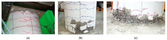 Figure 11 shows images of the failure of the RH-NS-T specimen. The cracks were evenly distributed in the upper part of the column from 50 mm to 400 mm when the loading was applied corresponding to the yield displacement. At the bottom of the column, the lap-splice was located up to 330 mm high. In this range, the longitudinal reinforcing bar ratio is doubled, so there is little cracking, and the cracks are evenly distributed in the location from 300 mm to 700 mm at the bottom of the column. At 5.0, the outside face of the bottom of the column had spalling first by the compressive force, and the concrete cover was damaged and fell off. Buckling of the reinforcing bar was observed at about 5 mm height. At the top of the column, many vertical cracks occurred between about 0 mm and 100 mm in height, and spalling began to appear insignificantly. At 6.0, the longitudinal reinforcement bar was first broken in a column that was subjected to tensile force during loading. At 8.0, the longitudinal reinforcement bar was broken at the top of the column at the time of loading. At this time, the longitudinal reinforcement bar at the bottom of the column was almost completely broken where the concrete cover was damaged.