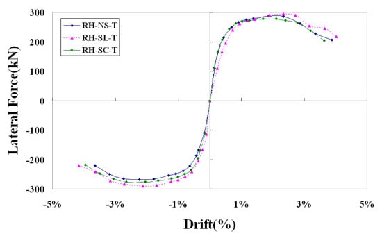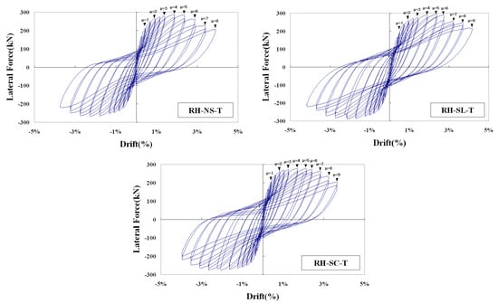 Figure 15 shows the load-drift ratio hysteresis curve of the transverse loading specimens. For the RH-NS-T specimens, it can be seen that the horizontal load capacity gradually decreases after a stable hysteresis curve up to 5.0. In contrast to the fact that the resisting force dropped after the breakage of the longitudinal reinforcement bar in the longitudinal loading test, the lateral load was endured more by the moment resistance force, even if the reinforcing bar breaks at the bottom of the column in the transverse loading test. This is because the top of the column can resist the bending moment as the plastic hinge. Thus, it was shown that even if the displacement was applied up to 8.0, the lateral load carrying capacity was reduced by only about 30%.