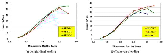 The seismic capacity of a member with nonlinear behavior can be expressed as the energy absorption and ductility factor during hysteretic behavior. The absorbing energy according to the ductility factor was calculated as the area of the hysteresis loop at each loading step. The energy absorption of each specimen is shown in Figure 17. For the case of the longitudinal loading, the energy absorption of the RH-SC-L specimen is higher because the displacement at the failure is slightly larger. For the case of transverse loading, the RH-SL-T specimen is larger than those of any other specimens. It is almost the same until 5.0, before failure occurs at the bottom of the column. After the bottom part of the column fractured, the energy absorption capacity at the top of the column contributed to the seismic performance. It is also confirmed in the failure mode that the top of the column withstands the load in the transverse direction even after damage. The energy absorption capacity at the top of the column is determined by the transverse reinforcing bar ratio at the plastic hinge region. Therefore, even if the specimen RH-SC-T without lap-splicing at the bottom of the column has the largest displacement when the initial damage occurred, the specimen RH-SL-T, which has larger transverse reinforcing bar ratio, has better seismic performance.