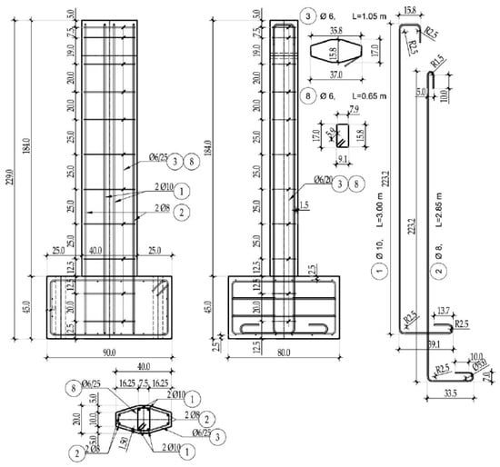 The test specimen consisted of two parts, an anchor block, and the column itself. The dimensions of the anchor block 90 × 80 × 45 cm were defined by conditions to achieve a firm fixation in the laboratory floor. All specimens had the same dimensions, with only minimal deviations that occurred during the erection. The height of the column measured from the anchor block was 185 cm. The cross-sectional shape of all columns was a polygon with maximum dimensions of 40 × 20 cm. The dimensions of the column specimens and the reinforcement details are shown in Figure 2.