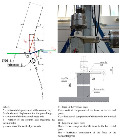Before starting the test, the distances of the individual press supports and the positions of the axis of the steel cap dowels in relation to the column axis were known (Figure 4). During the test the displacement of the column top Δ was measured with an LVDT measuring device, and the rotation of the axis of the column top β was measured with an inclinometer. In addition to the geometrical measurements, the components of the forces in the direction of the axis of each press were also measured. The actual vertical and horizontal force components acting on the column top were further determined according to the relationships shown in Figure 4.