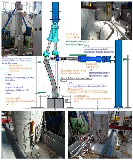Special equipment adapted to the dimensions of the column was used to test the column specimens in order to ensure fixed conditions in the laboratory floor and sufficient force introduction into the column. The joint axis of the fixing anchor bolts passing through the column foot are perpendicular to the axis of the horizontal press and is located in the axis of the column. Such an anchoring position did not provide sufficient fixation, so that an additional steel grid had to be erected to ensure fixation to the laboratory floor. The steel frames on which the presses are located were additionally stiffened with struts to minimize the displacement of the anchoring points of the press.