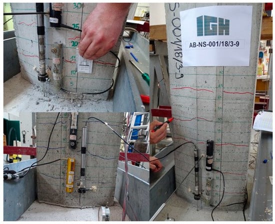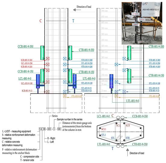 The stress level and deformation in the longitudinal reinforcement bars was monitored by strain gages installed during the concreting of the specimens. The position and number of the strain gages were not the same for each specimen. Since there were several parameters determined by experimental analysis, the strain gages were placed in the most suitable locations for recording the results of each parameter. All columns had built-in strain gages on the rebars in the area of the end section in the compression and tension zones. In most cases one strain gage is installed in the compression zone and two strain gages in the tension zone. For monotonically tested specimens, the compression zone of the cross-section is uniquely determined, whereas for cyclically tested specimens the compression zone is considered to be the one in which compressive stresses occur in the first load cycle. For monotonically tested specimens, which are marked AB-NS-001-2, AB-NS-001-6, and AB-NS-004-1, four additional strain gages were installed at the height of the plastic joint on the tensile reinforcement at distances from the end section of 100, 200, 250, and 300 mm. Cyclically tested column specimens marked AB-NS-001-4, AB-NS-001-8, AB-NS-001-9, AB-NS-002-2, and AB-NS-003-2 had strain gage pairs (compression-tension side) at heights of 100, 200, 250, and 300 mm. An additional stress level was monitored by a strain gage installed in the anchor foot just below the end section on the columns with the designation AB-NS-001-1; AB-NS-001-3; AB-NS-001-5; AB-NS-001-7; AB-NS-001-9; AB-NS-002-1-2; and AB-NS-003-1-2. HBM K-CLY4-0030-1-120-3-020-N strain gages with a 3 mm measurement base were used. Figure 7 shows the arrangement of the measuring devices near the plastic joint. The column AB-NS-001/18/9-9 is shown in this figure, as this column had the most measurement points.