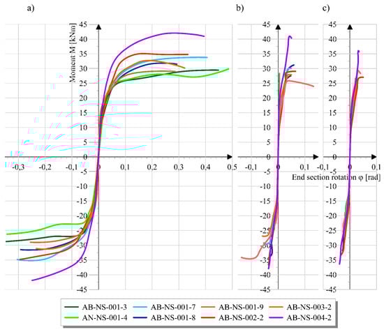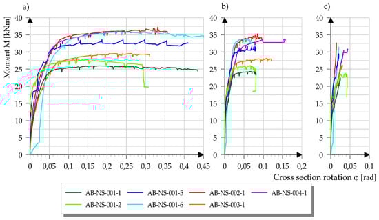 The influence of the axial force on the displacement–force ratio is visible in the first four cyclically tested specimens. During the test, the specimens AB-NS-001-3 and AB-NS-001-4 were loaded with a lower axial force than the specimens AB-NS-001-7 and AB-NS-001-8, resulting in a lower cross-sectional load capacity. It should be noted that the compressive strength test showed that the first two sets of specimens had a concrete compressive strength one class higher than the other two (47.5/36.0 MPa). It can therefore be assumed that the differences would be even greater for the same concrete properties. Looking at the rotation of the cross-section when the failure is reached on the same specimens, it can be seen that for both specimens with a smaller value of the axial force, the rotation of the cross-section is higher. Specimen AB-NS-001-9 was tested with an axial force of 125 kN. The load bearing capacity of this specimen is between the specimens tested with forces of 100 and 150 kN, while its rotation is lower than that of the other specimens tested in this series, which is also due to the lower compressive strength of the concrete.