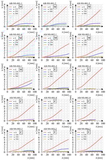 A monotonically tested specimens showed a crack at a height of 200 mm, which differs significantly from all other specimens (the ratio of moment and cross-sectional rotation of this specimen also showed differences compared to other tested specimens). These two cracks at the bottom of the column have a constant change in width as the displacement of the top of the column increases and have a significant effect on the amount of element rotation around the plastic joint. Other cracks along the height of the column do not show significant width growth during the test (in some cases it even decreases). The crack width measurements of each specimen are shown in Figure 10. The results given apply to monotonic (designation M) and cyclic (designation C) specimens.