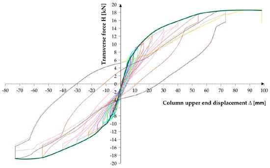 In the first phase, the desired value of the axial load was applied by a vertical press (Table 1). The vertical force was applied by means of a force control. Due to the large number of measuring points, all measuring points were checked after the force was applied and the position of a single measuring instrument was recorded. The first test phase was the same for all test specimens. In the second phase a horizontal load was then applied. The second test phase differed depending on the type of load (monotonic, cyclic). The horizontal load was applied by the displacement control method, i.e., a time interval is defined in which a certain displacement is reached. The horizontal force was measured by a compression–tension dose with a capacity of 100 kN. This type of dose had to be used because of the cyclical input of the horizontal force at the top of the column. Due to the horizontal displacement at the top of the column, the vertical press rotates and was thus stretched. This leads to a decrease in the press force, so that a constant force correction is required to keep the vertical force constant. At this stage the displacement in the horizontal press increases until the specimen fails. The effect of the rotation of the vertical press results in an additional horizontal force that acts together with the horizontal press. This effect can be seen in Figure 4.