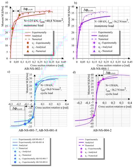 The numerical analysis was performed with a commercial software professionally used for bridge structures using FEM. A non-linear numerical analysis was used, which included material and geometric non-linearity. The material properties were taken as material working law diagrams (stress/deformation ratio) for concrete (Equation (2)) and for reinforcement (Equations (3)–(5)). These expressions resulted in a good match of the constitutive laws with the experimentally obtained ones. The quantities and the position of the reinforcement in each cross-section of the column were taken in the same way as in the experimentally tested specimens. Numerical column models comprise cantilever 3D beam finite elements (mesh size 2 cm) with 6 degrees of freedom which are fixed for all translations and rotations at the point corresponding to the connection of the column and the anchor block. The beam axis was assigned the column cross-section in its center of gravity. Model of the column was then loaded horizontally in steps corresponding to those performed in the experimental tests. The load increase was carried out until the load-bearing capacity of the element was reached. The vertical axial load was entered immediately at the beginning of the calculation and remained unchanged until the end of the calculation. The amount of the axial load changes for different columns (Table 1). Due to the properties of the software package used, it was possible to perform the calculation until the maximum concrete stress value and the corresponding relative deformation was reached. Then the ratio of moment and rotation of the final cross-section was observed. Points of interest, such as the yield strength, are marked to compare the results. Only the monotonic load was applied in the numerical analysis and the results obtained were processed for comparison with experimental and analytical results.