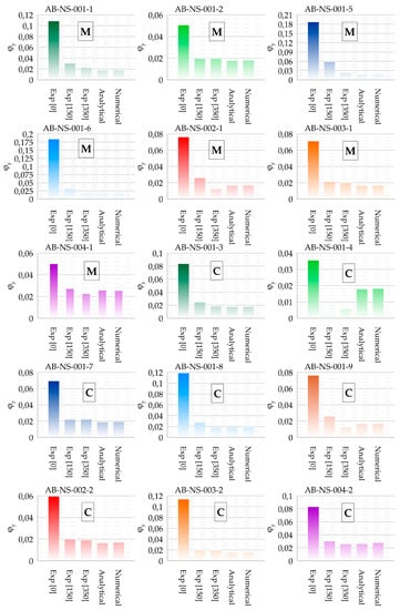 The values of the angle of rotation angle when reaching the yield strength of other monotonically tested columns are shown in Figure 15. A comparison of the results for the end section and two sections where relative deformations were measured in relation to the results obtained analytically and numerically is given. The results of the tested specimens with smooth reinforcement show on average a five-times higher rotation of the experimentally obtained end section when reaching the yield point compared to the results obtained with analytical and numerical methods which do not take into account the effect of slippage from the anchoring area (Figure 15). For specimens with ribbed reinforcement (AB-NS-004), the rotation angles of the end cross-section when reaching the yield point in the experiment have a significantly smaller difference from the results obtained by analytical and numerical analysis (two-times the rotation of the experimental result).
