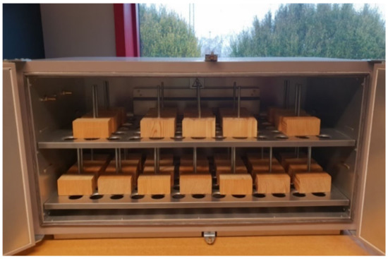 To get the results for the highest service class, Siberian larch (Larix sibirica) wood was used for the timber components [27]. After three weeks in a climate enclosure room with a controlled atmosphere, the moisture content was around 12% (Figure 2). The measured average density was close to 600 kg/m3, with a standard deviation of 25 kg/m3.