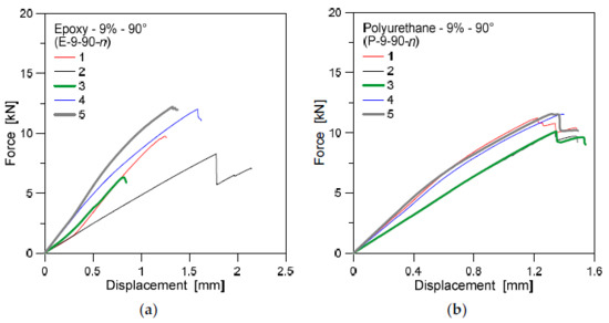 Experimental force–displacement results for specimens with (a) epoxy or (b) polyurethane glue, under 9% moisture and perpendicular rod-to-grain arrangement.