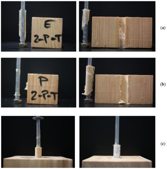 Example of failure configuration for the tested samples: (a) epoxy and (b) polyurethane bonded rods for half-size specimens (18% moisture, parallel rod-to-grain arrangement) and (c) full-size specimens.