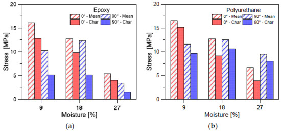 The estimated results are shown in Figure 8, in terms of stress peak at failure for each set of specimens (under the assumption of uniform stress distribution for the bond-line as a whole). Mean and characteristic values of ultimate stress are grouped by adhesive type and rod arrangement, as a function of the service class/moisture content.