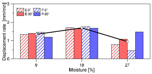 In this regard, it is worth mentioning that the imposed displacement rate (in the range of 0.5–2.0 mm/min), as previously discussed, was adapted test by test. The postprocessing stage of experimental measurements was quantified in average rate values that are summarized in Figure 9, as obtained for each series of specimens. Worth noting are the lower rate values for epoxy or polyurethane specimens under high moisture (27%) and bonding parallel to the grain. This was required by the pronounced viscous response of adhesives used.