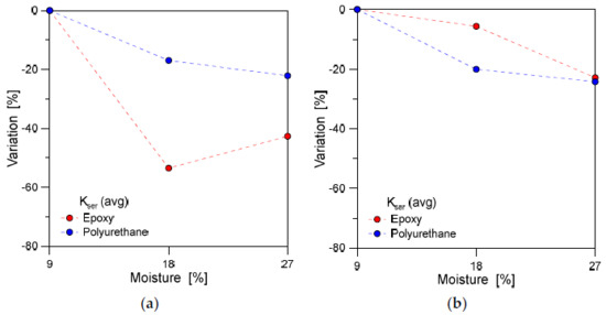 The service class, as shown, generally resulted in severe modification of mechanical parameters for the tested specimens, both for epoxy or polyurethane bonded rods, with more pronounced effects for loading parallel to the grain (Figure 10a). In the perpendicular direction, a rather stable variation of average stiffness results can be observed in Figure 10b for both the adhesive types.