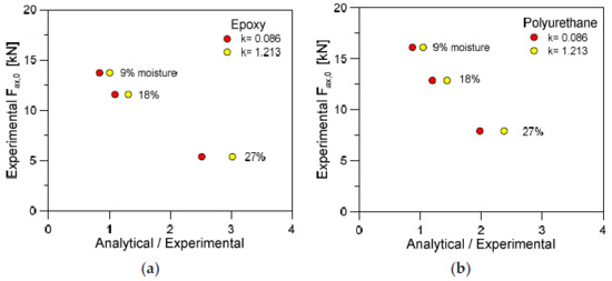 The empirical model of Equation (9) agrees with the experimental trends earlier discussed in Figure 8. As far as the moisture content increases and the adhesive degradation of mechanical properties increases, Equation (9) itself severely overestimates the expected axial force at failure for the tested joints. In Figure 12, the empirical derivation of material strength is shown for epoxy or polyurethane specimens, as obtained from the mean experimental results.