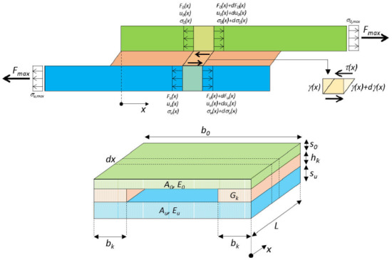 where A0 is cross-area of the wooden part; bk is the mean width of the adhesive layer; σ0,max represents the maximum normal stress in the BiR; x is the length coordinate; L denotes the length of the adhesive joint (anchorage length); ω is a correction factor that can be estimated from: