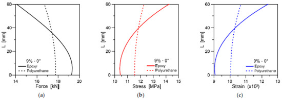 From the developed analytical model, the variation of the shear force, stress and strain in BiR connections can be thus predicted along the bonding length L. Selected examples are proposed in Figure 14.