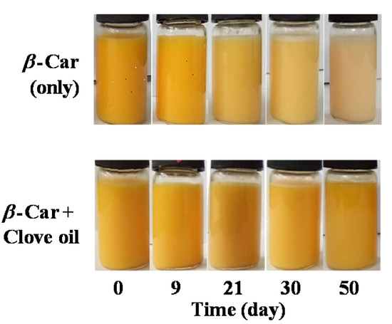 Appearance of oil-in-water with β-Car during storage under ambient conditions and on exposure to light in glass jars with and without addition of 4 µL/mL emulsion of clove oil.
