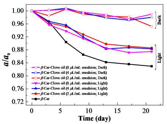 Red bleaching (relative redness a/a0) of oil-in-water emulsion with β-Car with or without the addition of clove oil during storage in the dark or exposed to light of 22,000 Lx at 25 °C.