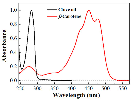 All-trans-β-carotene (β-Car) was from Sigma-Aldrich (St. Louis, MO, USA). Clove oil, containing 85% eugenol and isoeugenol, was from O’plants (Shanghai, China). Soybean oil was from Yihai Kerry Food Co., Ltd. (Beijing, China). Whey protein isolates (WPI) were from HIRMAR (Los Angeles, CA, USA). Lecithin (95%) was from Arbor Star Biological Technology Co., Ltd. (Beijing, China).