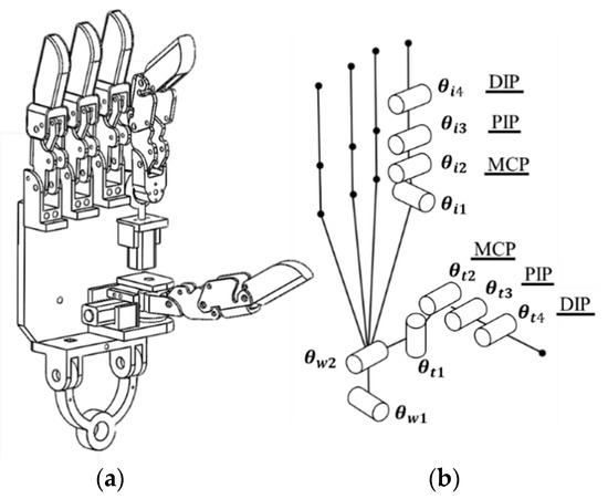 In this section, the geometric description of the anthropomorphic hand and the scenario of the motion task are discussed. The anthropomorphic hand is designed according to the human hand anatomy. In this anthropomorphic hand, the wrist mechanism is designed to possess two degrees of freedom in order to mimic the motion of a human’s wrist. For fingers, the thumb and index finger each has three joints, namely, the metacarpophalangeal (MCP), the proximal interphalangeal (PIP), and the distal interphalangeal (DIP) joints, as shown in