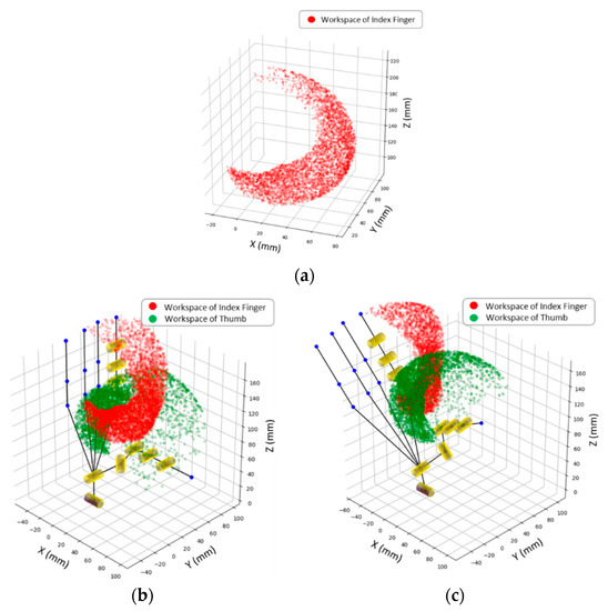 Table 5 lists the conditions and results for three illustrated cases. The illustrated case #1 and case #2 were those with reachable target points, whereas an unreachable target point was assigned in the illustrated case #3. In the illustrated case #1, the target fingertip point sets were (50, 0, 130) and (75, 30, 125) for the index finger and the thumb, respectively. As shown in