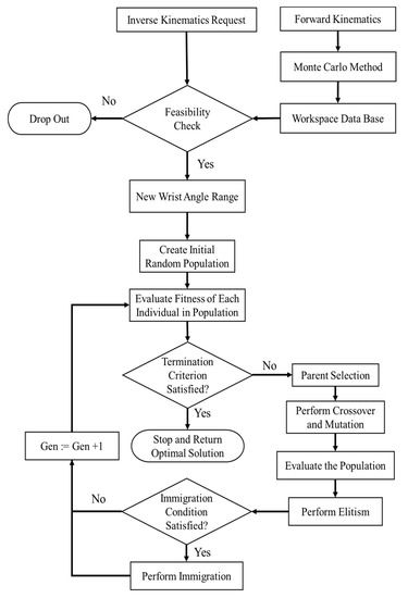 23]. The best individuals immigrate to the new population to replace the worst ones at defined intervals, which is called “structured memory immigration operator.” In this research, the immigration operator was set to occur every three generations in order to obtain better optimal solutions. Half of the population was replaced with the best individuals of the previous generation in the same quantity. As mentioned, we can ensure that the solution to the IK problem is near the best individuals of the population through the feasibility check. In this case, the introduced immigration operator is more suitable for the population than a random immigration operator. As a result, the tournament selection can have a better chance of selecting better chromosomes and maintaining the diversity.