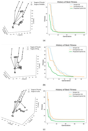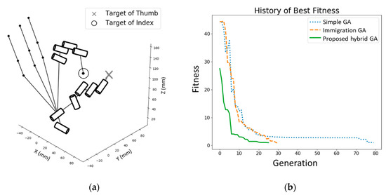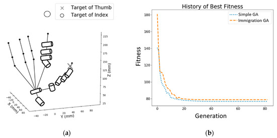 Figure 8 shows a schematic illustration of the IK solutions for the thumb and the other three fingers. The diagram of the best fitness value over generations indicates that the proposed algorithm outperformed the simple GA and the immigration GA. Through these cases, it was confirmed that the proposed algorithm is capable of solving the IK problem of a multi-fingered robotic hand.
