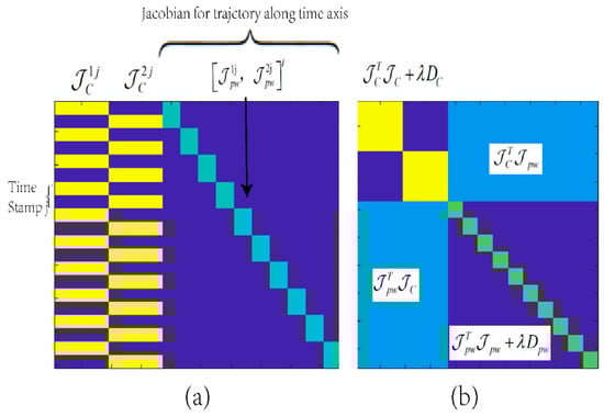 To solve this problem, we use two HFR cameras with frame-rate multiplication, e.g., one HFR camera under 540 FPS, and another HFR camera under 1080 FPS. The frame-rate of the second HFR camera is twice that of the first camera. This is the same as Figure 2 for the first 37 ms, i.e., 20 frames for the first camera and 40 frames for the second camera. The Jacobian matrix of these two HFR cameras are presented in Figure 3. Each 6 × 18 matrix block of yellow and purple presents the Jacobian matrix of both cameras at time stamp j and j + 1, with 4 × 18 for both cameras at time j, 2 × 18 for camera two at time j + 1. The matrix block in yellow is the . The matrix block in light blue is at time stamp j and for time j + 1. The Jacobian matrix and Hessian matrix are also the sparse matrices, and with Equations (11) and (12), the iteration step can be solved efficiently.