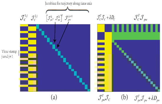 Stereo vision is widely used for non-contact measurement, which is suitable for the physical evaluation of an explosion. In this section, we use the synchronized stereo HFR camera’s captured motion. For each fragment captured by these stereo HFR cameras, during its movement, the formation of the Jacobian matrix is shown in Figure 2. Figure 2 presents the HFR cameras with 540 FPS of the first 20 samples (e.g., for the first 37 ms). In Figure 2, each 4 × 18 matrix block of yellow and purple presents the Jacobian matrix of both cameras at time stamp j, and the matrix block in yellow are the . The matrix block in light blue is at time stamp j. The matrix block in purple from Figure 2 are zeros. Both the Jacobian matrix and Hessian Matrix are sparse matrices. Therefore, we use the Shur Complement to solve Equation (5). Equation (5) can be specified as: