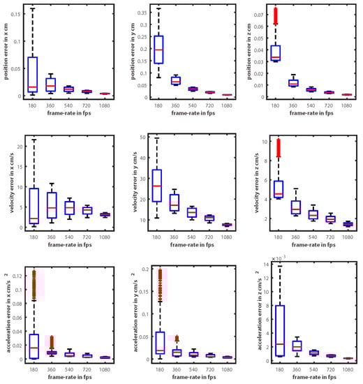 Boxplot of position error, velocity error and acceleration error (cm/s2) in three axes of the world coordinate with a frame-rate from 180 to 1080 FPS.