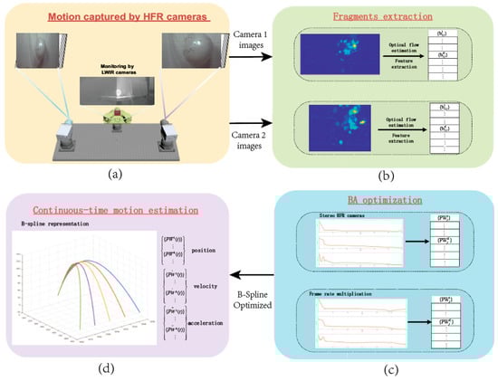Procedure of our method. (a) Motion captured by HFR cameras; (b) Fragments extraction; (c) Bundle adjustment optimization; (d) Continuous-time motion estimation.