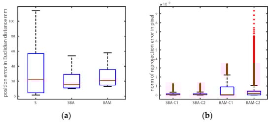 Boxplot of (a) position error, (b) reprojection error of each camera.