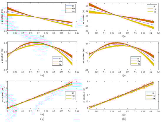 Using Equations (18)–(20), the continuous-time’s position, velocity and acceleration of a moving object can be estimated. The sampling frequency of knots (i.e., the frame-rate of cameras) influences the accuracy of the estimated result. We use HFR cameras with a different frame-rate to capture the known motion of a moving object. Using cubic B-spline motion estimation, the distribution of the position error, velocity error and acceleration error in three axes of the world coordinate are shown in Figure 4.