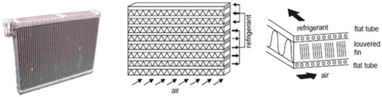 To evaluate the concept competitiveness, we considered multiple criteria in advance. Specifically, we selected five key criteria which represent the CR in the QFD: heat-exchange performance (kcal/h), air pressure drops (mmAg), refrigerant pressure drops (kgf/cm2), weight, and cost. As depicted in Figure 3 by Limperich, Braun, Schmitz, and Prölß [49], air travels through the core and refrigerant passes through several holes in the tubes to exchange the heat between the hot air and the cold refrigerant.