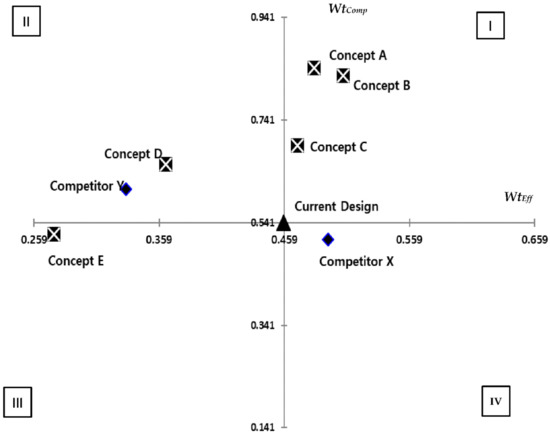As shown in Table 6, concept B was ranked first with 1.334 and concept E was ranked last with 0.793. Thus, we selected concept B as the best new concept. In addition, we conducted a quadrant analysis to separate the new design concepts into four categories. As represented in Figure 4, the vertical axis denotes the WtComp such that a design concept with a WtComp score higher than the current design’s WtComp (equal to 0.541) is located above the horizontal axis. The horizontal axis denotes the WtEff such that a design concept with a WtEff score higher than the current design’s WtEff (equal to 0.459) is located to the right of the vertical axis.