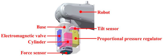 As Figure 1 shows, the pneumatic constant force actuator mainly included a tilt sensor (KELAG Kabel variante kas90), a cylinder (SMC MGPM20-30Z), a force sensor (LH Z05A-200N), a base, a proportional pressure regulator (Festo VPPE-3-1-1/8-10-010-E1) and an electromagnetic valve (Parker A05PS25X-1s). Among them, the base was connected with the robot by bolts, and the force sensor had its thread for connecting the workpiece.
