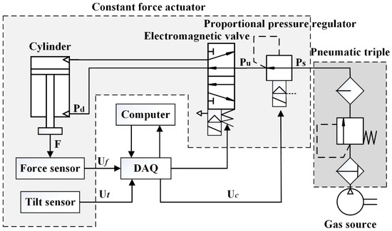 The pneumatic system control diagram is shown in Figure 2. The force sensor fed back the contact force F to the electrical signal Uf in real time, and the tilt sensor was used for obtaining the attitude signal Ut of the actuator. The signals were transmitted to the host computer through the data acquisition (DAQ) board. Then, the host computer ran the controller and adjusted the control voltage Uc of the proportional pressure regulator, making the output force F meet the set value. It also controlled the on and off state of the electromagnetic valve to change the direction of the force. As a result, the system had force perception and force control capabilities.