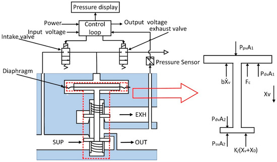 where is the air pressure in the pilot cavity; is the output pressure of the proportional pressure regulator; is the supply pressure of the proportional pressure regulator; is the effective area of the diaphragm; is the cross-sectional area of the valve chamber; m is the self-weight of the valve spool; is the displacement of the valve spool; is the initial deformation of the spring; is the viscous damping coefficient; is the equivalent spring stiffness; and is the Coulomb friction.