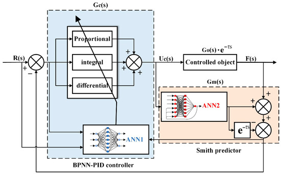 The structure of the improved PID control method proposed in this paper is shown in Figure 6. The BP neural network-Smith predictor-PID (BPNN-SP-PID) controller was divided into two parts. One part was the BPNN-PID controller. ANN1 could realize self-optimization of the PID parameters and improve the control performance. The other part was the Smith predictor. The Smith predictor was used for reducing the influence of the pure time delay [27]. ANN2 was used for identifying the open-loop model of the controlled object Go(s), eliminating the pure time delay. Higher identification accuracy brought by ANN2 could make the Smith predictor compensate the time delay more effectively. The two parts are described in detail below.