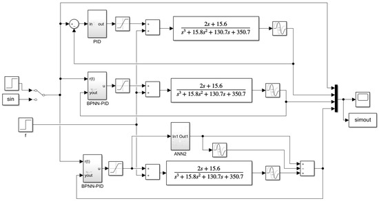 In the block diagram shown in Figure 11, ANN2 is a neural network that describes the controlled object. It was trained and solidified to generate a Simulink module and added to the block diagram. The inside of the BPNN-PID structure was the packed neural network ANN1 and a PID controller. The online learning neural network ANN1 was realized by using the S-function module. There were two kinds of input signals as the setting force: a step signal with an amplitude of 20 N and a sin signal with an amplitude of 20 N and frequency of 0.2 Hz. The simulation data of the three controllers were exported through the simout module.