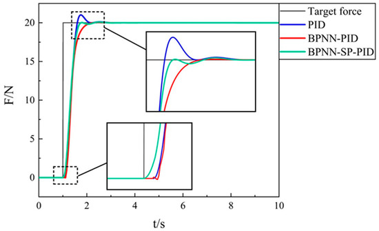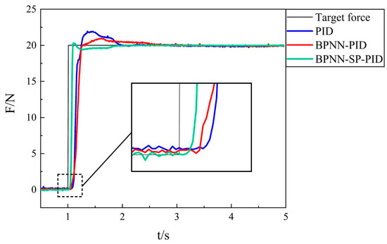 The experimental results coincided with the simulation results. The BPNN-SP-PID controller was the fastest at the beginning stage, which needed ~30 ms of action time, while BPNN-PID and PID took ~70 ms and ~80 ms, respectively. At the approaching stage, BPNN-SP-PID was still the fastest to reach the set value of 20 N and to enter the ideal range. The adjustment times of the BPNN-SP-PID, BPNN-PID and PID were 0.16 s, 0.46 s and 0.48 s, respectively. The three controllers also presented different degrees of overshoot. The overshoot of BPNN-SP-PID was the smallest, being only 1.6%, while the overshoots of BPNN-PID and PID were 4.9% and 9.7%, respectively. At the stable stage, the residuals of the three were different from the ideal scenario in the simulation, but the steady state error could also be guaranteed to be within 0.2 N.
