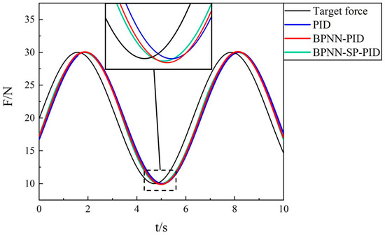 A sinusoidal signal with an amplitude of 20 N and frequency of 0.2 Hz was set for the simulation, and the response curves of the three controllers were obtained, as shown in Figure 13.