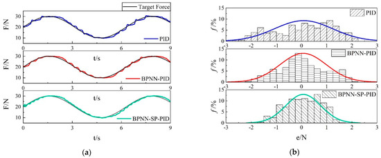 All three controllers could smoothly follow the setting curve but had different degrees of lag. BPNN-SP-PID produced the smallest lag, followed by BPNN-PID, and the worst was from the PID method. The difference in response time also brought about a difference in control accuracy. The maximum force error of PID reached 3.22 N, and the average error reached 2.09 N. The maximum error of BPNN-PID was 2.65 N, and the average error was 1.68 N. The maximum error of BPNN-SP-PID was 2.63 N, and the average error was 1.59 N.
