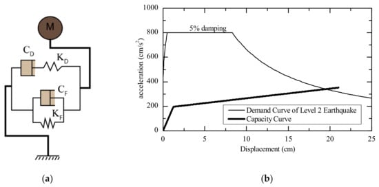 The capacity curve of the system is shown in Figure 3b. The demand curve is presented in the form of an acceleration–displacement spectrum of the selected earthquake ground motion. In this study, the Level-2 earthquake defined in the Building Standard Law of Japan [3] was used to generate the design acceleration–displacement response spectrum with a 5% damping factor. The latter was adjusted according to the value of the effective damping using the reduction factor, , in Equation (10), adopted by the JSSI manual [17] from the study conducted by Kasai et al. [28,30].